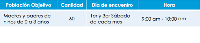 Con las madres y padres de los niños de 0 a 3 años, realizamos encuentros tendientes a fortalecer el amor de Dios en su corazón, proyectándolo hacia sus hijos y a su hogar.
